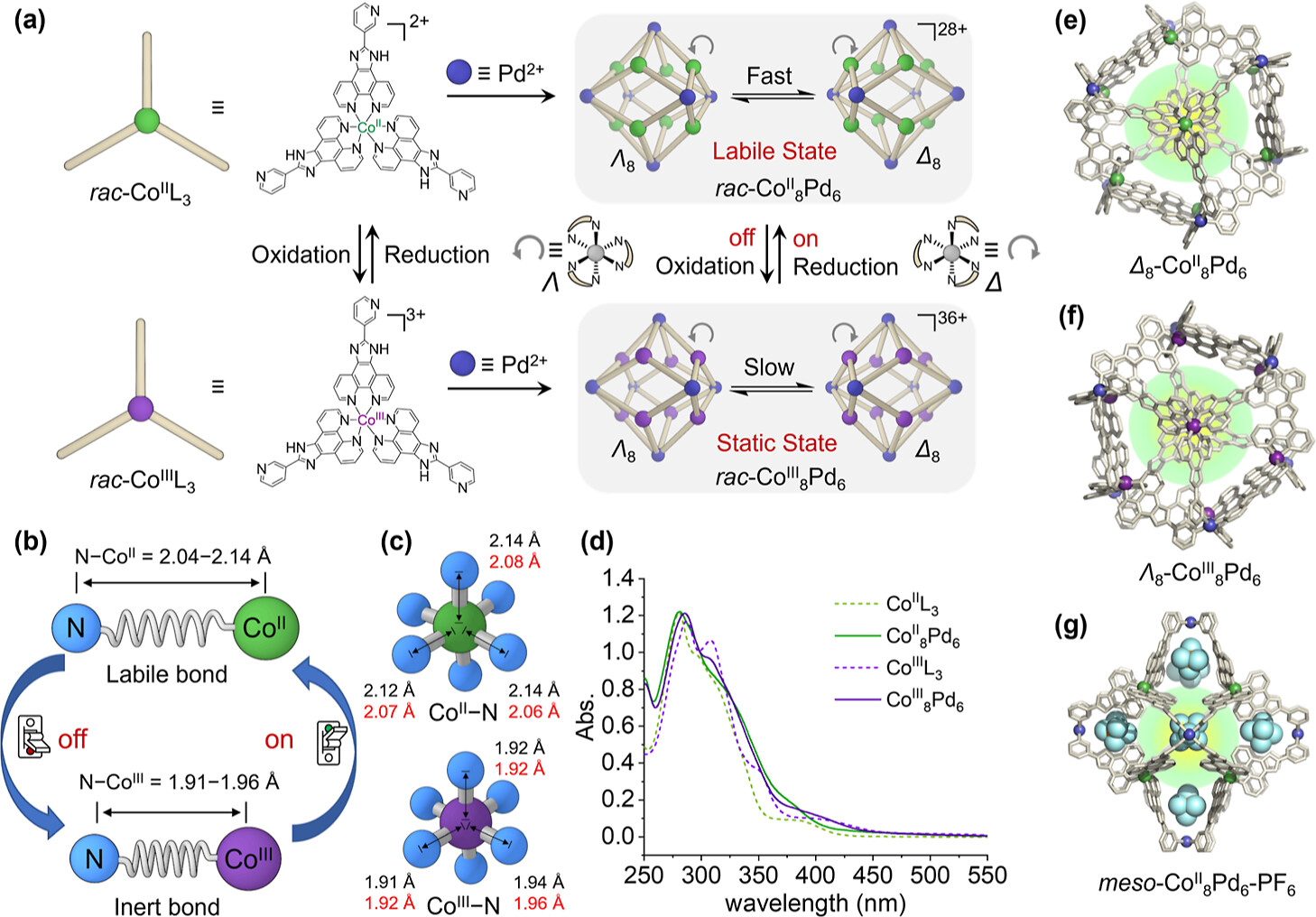 近日,吴凯/苏成勇教授课题组将氧化还原活性的Co中心作为组装基元,引入到菱形十二面体异金属-有机笼,获得了整体结构动态性与立体化学原位可调的Co8Pd6异金属-有机笼。处于还原态的CoII具有更长的Co-N键,表现出更高的动力学活性与结构动态性;而氧化态的CoIII 则具有更短的配位键以及更高的动力学惰性与热力学稳定性,因此该分子笼的氧化与还原态分别呈现出稳态与动态的特征,可通过金属中心的氧化还原实现手性的转换与康顿效应的输出开关控制(图1)。研究人员首先将氧化还原活性的CoII/CoIII金属中心引入三脚金属配体,进一步与PdII进行二次组装,分别得到了二价CoII中心的Λ8/Δ8-[Pd6(CoIIL3)8](BF4)28以及三价CoIII中心的Λ8/Δ8-[Pd6(CoIIIL3)8](BF4)36两对对映异构体超分子笼。由于Co金属中心可以在温和条件下进行氧化还原反应,因此使用简单的H2O2/对苯二酚即可实现笼整体价态在28+与36+之间的切换。