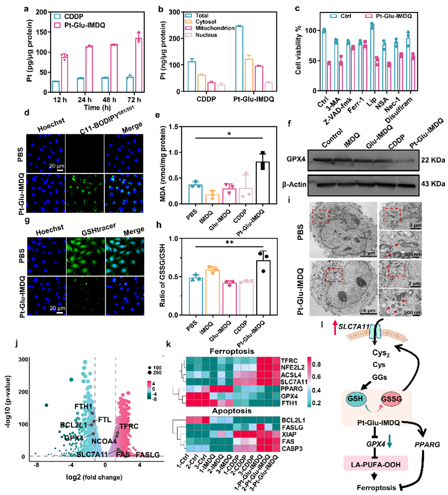 本研究先聚焦双锁Pt(IV)前药结构如何通过空间限制药物激活,通过谷胱甘肽和γ-谷氨酰转肽酶(GGT)的顺序激活,从而在肿瘤微环境中靶向释放细胞毒性Pt(II)和TLR7/8激动剂IMDQ,引发了凋亡和铁死亡的双重细胞毒性作用。