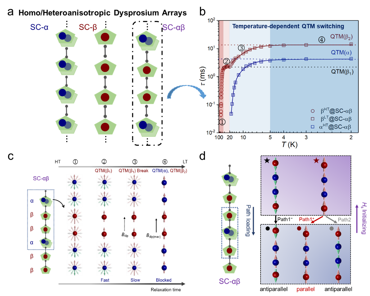 3 a) 均质/异质镝基自旋链的结构示意图;b) 交流磁性测试中的磁动力学协同行为;c协同行为的内在机制示意图;d) 磁化路径操控的自旋极化差异。