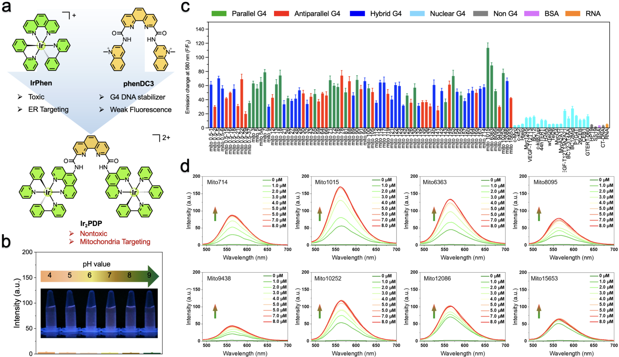 2.(a) Ir2PDPIrPhenphenDC3结构图。(b)不同pH条件下Ir2PDP荧光图。(c) Ir2PDP对不同G4 DNA序列、非G4 DNA序列、双链DNARNA及蛋白质的磷光响应强度变化。(d)不同mitoG4 DNA序列滴定Ir2PDP的磷光强度变化图。