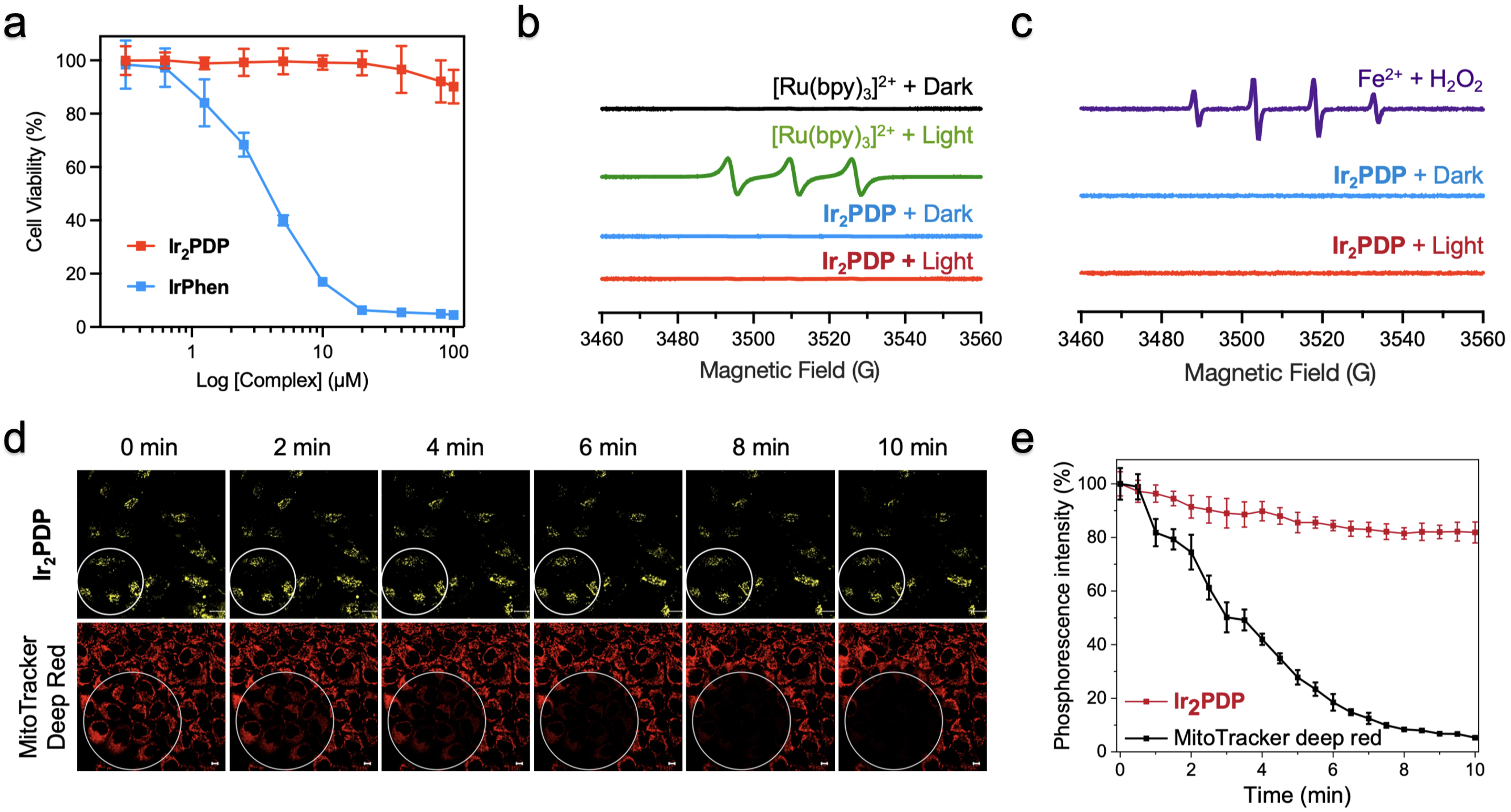 3. (a) Ir2PDPIrPhen在不同浓度下的48小时细胞存活曲线。(b) (c) 光照/黑暗条件下Ir2PDPEPR检测结果。(d) (e) Ir2PDP抗光漂白检测。