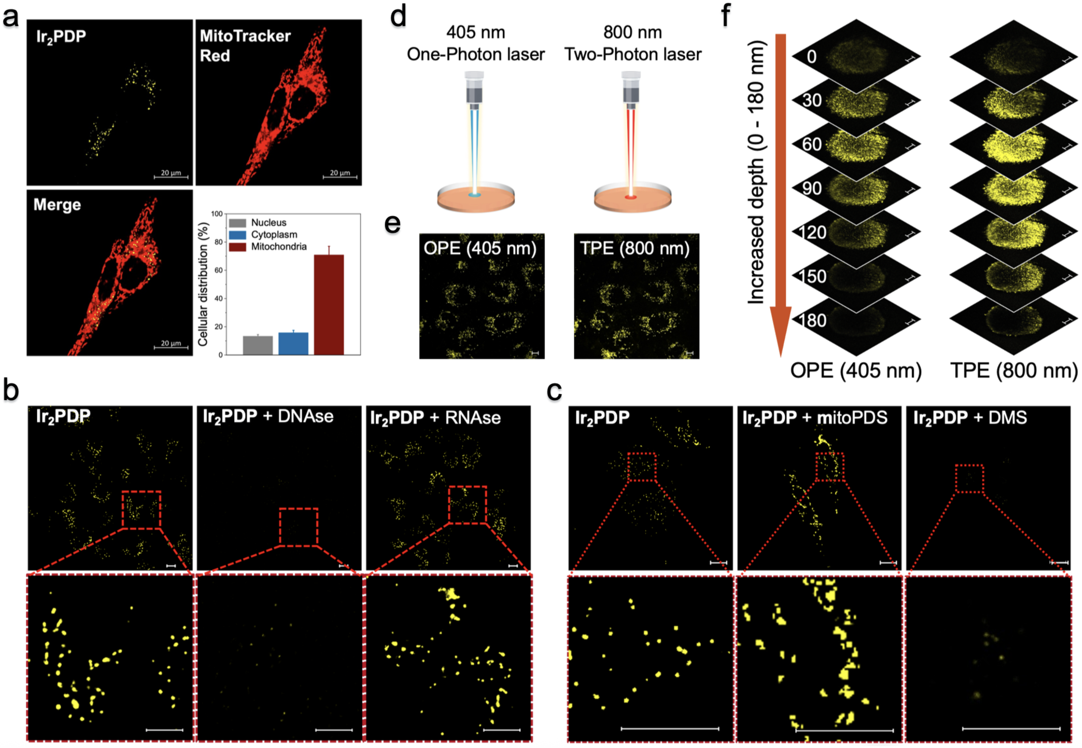 4. (a) Ir2PDP线粒体靶向检测结果。(2)DNA酶和RNA酶消化细胞后,Ir2PDP共聚焦成像检测结果。(c) mitoPDSDMS预孵育细胞后,Ir2PDP共聚焦成像检测结果。(d)单双光子成像示意图。(e)单光子(405 nm)和双光子(800 nm)激光共聚焦成像结果。(f)单光子(405 nm)和双光子(800 nm)激发下,Ir2PDP组织3D细胞球穿透深度模拟检测。