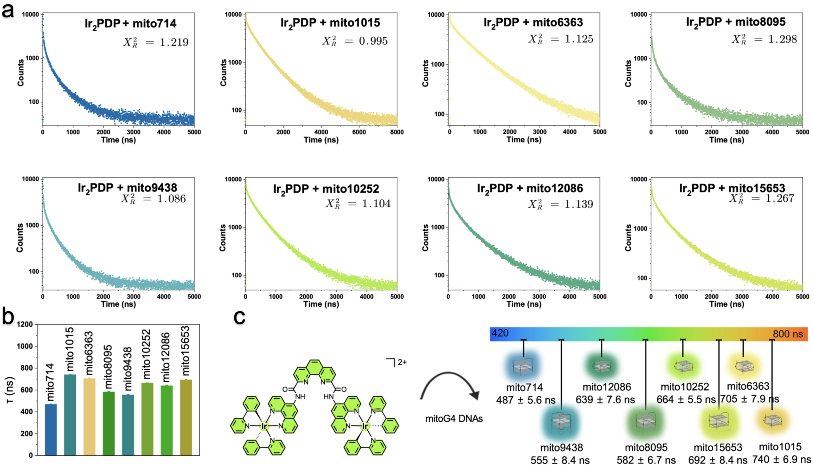 5. Ir2PDP与不同mitoG4 DNA序列结合后的磷光寿命变化检测。(a)磷光寿命衰减曲线。(b) 磷光寿命统计结果。(c) Ir2PDP通过磷光寿命区分不同mitoG4 DNA序列示意图。