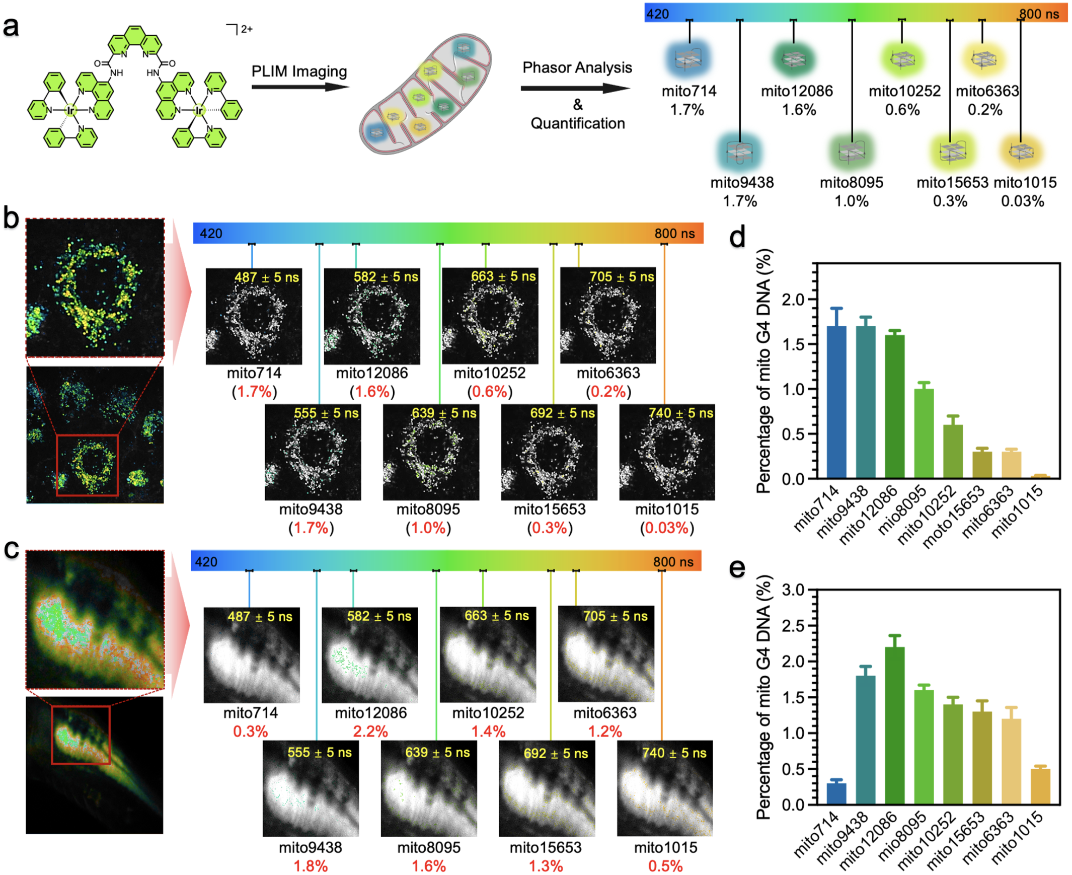 6.(a)Ir2PDP区分不同mitoG4 DNA序列的示意图。(b)细胞水平磷光寿命成像和不同序列分布情况。(c)活体水平磷光寿命成像和不同序列分布情况。(d)细胞水平量化不同序列丰度。(e)活体水平量化不同序列丰度。