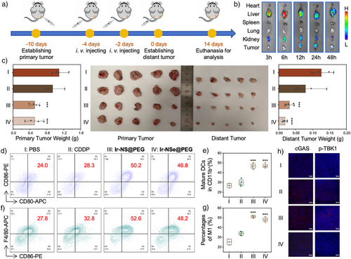 铱基胀亡诱导剂导致线粒体功能障碍和mt-DNA损伤可强效激活 cGAS-STING 先天免疫通路和细胞免疫原性死亡,双重作用共同激活免疫反应,包括树突状细胞成熟、M1 型巨噬细胞极化以及细胞毒性 T 细胞激活,从而重塑肿瘤免疫微环境,并在体内建立长期免疫记忆。凭借化疗与免疫治疗的协同效应,该体系不仅有效根除原发肿瘤,还能建立持久保护性免疫屏障以阻断肿瘤复发,治疗成效显著(图4)。同时未对小鼠产生明显健康损害,安全性得到充分验证。