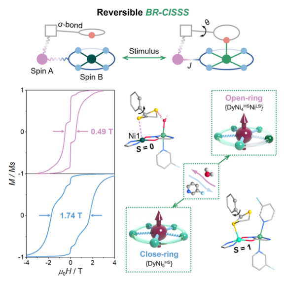 物质固有的能级结构在很大程度上决定了其磁性、发光、导电与催化等重要性能,揭示能级与微观结构的内在关联并实现其精准调控,是化学研究的核心科学问题之一。单分子磁体可在分子尺度展现磁化双稳态与磁滞回线,在高密度信息存储和自旋电子器件中具有重要应用前景。近年来,单一自旋载体的单离子磁体已取得显著进展,而包含多种自旋–自旋相互作用的多自旋体系因磁弛豫机制复杂,研究进展相对迟缓。利用原位物理或化学刺激对多自旋体系进行精确自旋调控,对阐明其弛豫机理具有重要价值,但也对分子的合成与结构设计提出了严峻挑战。