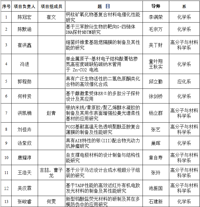 化学实验教学中心《关于申请“第二十二届(2021学年)创新化学实验与研究基金”项目的通知》文精神,经学院专家评审,决定对《钙钛矿氧化物基复合材料电催化性能研究》等13个项目予以立项,资助经费5000元/项目。具体的名单见下表或附件1。