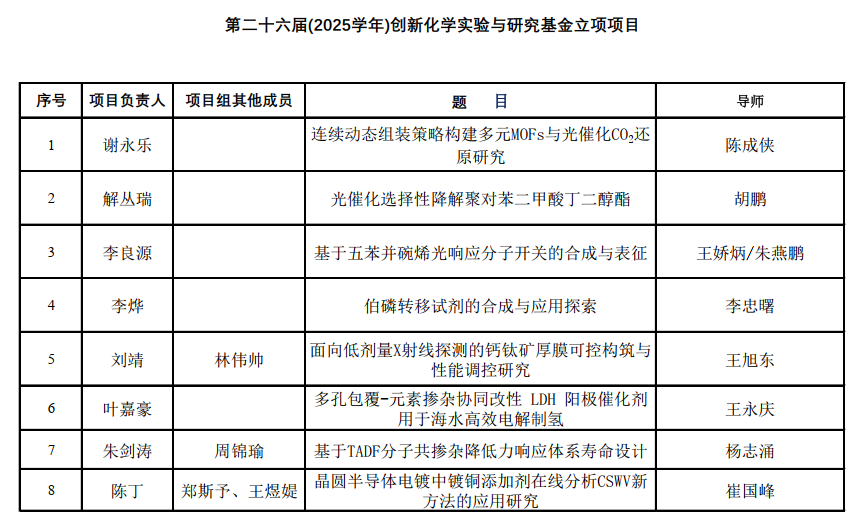 化学实验教学中心《关于申请“第二十六届(2025学年)创新化学实验与研究基金”项目的通知》文精神,经学院专家评审,决定对《连续动态组装策略构建多元MOFs与光催化CO2还原研究》等8个项目予以立项,资助经费5000元/项目。具体的名单见下表或附件。