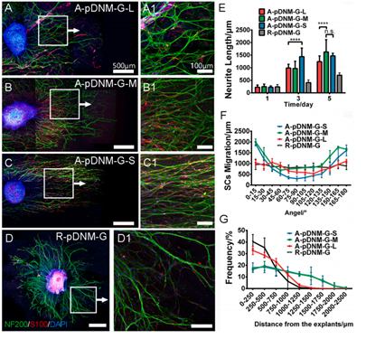 近期该团队通过定向冷冻-干燥加工技术,在DNM-gel中构建取向的微通道结构,这种微通道很好的模拟了天然神经内膜管的结构(图1),并且通过制备条件的改变,能够实现微通道的直径在20-100 μm之间调控。体外DRG培养证明,相比于无序多孔的R-pDNM-G导管,取向的微通道结构能定向的引导轴突延伸和施万细胞的迁移。同时通道尺寸在20-50 μm范围内的A-pDNM-G-S和A-pDNM-G-M导管对轴突延伸的长度、施万细胞迁移距离和取向行为有明显的促进作用(图2)。