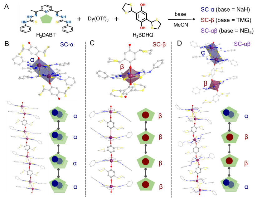 近期,该团队首次利用强点电荷的对苯二酚配体作为轴向连接子,实现了强各向异性五角双锥镝基单分子磁体(Dy-SMM)基元的定向组装。通过改变碱的种类,将两种不同的强各向异性Dy-SMM单元(α和β)以均质和异质组装的方式精确地排列成三例的镝基自旋链(图2)。